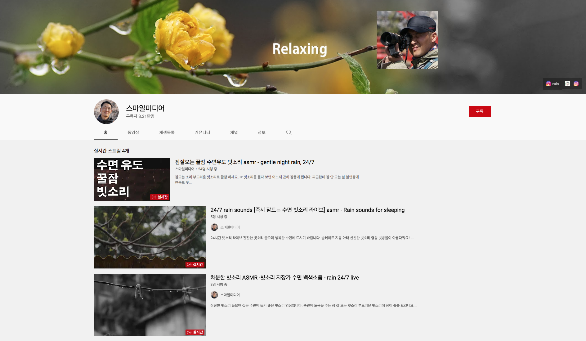 어느덧 시간이 흘러 저도 나름수면음악에 조예가 깊은 지경에 이르렀네요.그래서 오늘은 저처럼 불면증으로 고생하시는분들에게 조금이나마 도움이 되고자 글을 남깁니다.아래로 제가 즐겨 듣는 ASMR유튜버들입니다.같은 소리라도 인공적으로 녹음한 소리들이있는데 그것보다는 천연의 소리를 녹음했을때 저는 잠이 더 잘오는걸 알았습니다.쉽게 말씀드려 효과음향 같은걸 짜집기 한 건아무래도 효과가 덜했다는 신기한 이야기입니다.