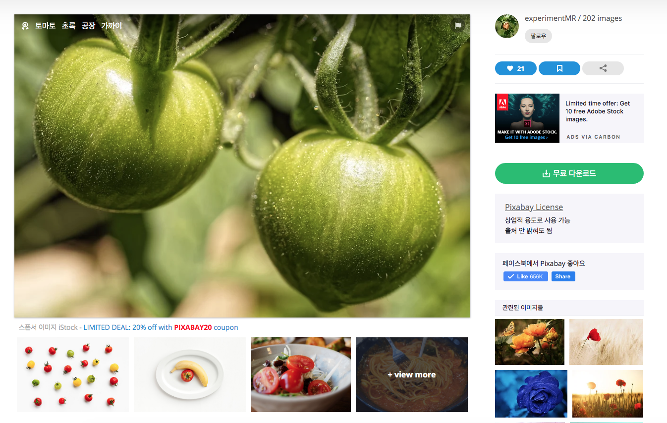 픽사베이의 고마운 이미지들을 이제부터 다운로드하여서 블로그 포스팅이나 다른 곳에 잘 사용하시면 됩니다. 보인 이미지를 하나만 누르고 들어가서 다시 설명드리겠습니다. 아래처럼 '토마토'를 검색해서 보여진 이미지를 하나 선택해서 들어갔다고 합시다. 아래와 같이 토마토가 크게 보입니다. 그럼 우측에 있는 녹색 무료 다운로드를 누르시고 하시면 됩니다. 그 버튼 위의 아도비 광고창을 누를 필요도, 토마토 밑에 있는 스폰서 이미지 사이트인 아이스톡에서 판매하고 있는 이미지를 누르고 들어갈 필요도 없이 말입니다.(그러지 마세요. 심부름 보내면 자꾸 옆길로 빠지는 사람들이 있는데 할 일을 하십시오.)